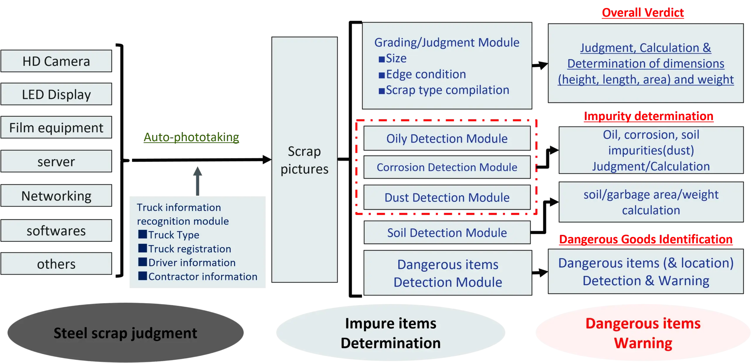 It has more than 40 various types of AI algorithm models to identity scrap categories,dimension, dust, rust, oil and hazard items. and it has achieved an accuracy rate of over 95% applied in enterprises such as Jingye Iron and Steel, Jiyuan Iron and Steel, and Longteng Special Steel.